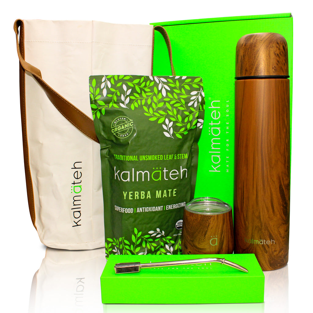 Includes: Wood Classic Mate Gourd, Wood Termo 1000ml, Organic Yerba Mate, Cream Matera Tote Bag and a Beautifully Handcrafted Alpaca Bombilla!