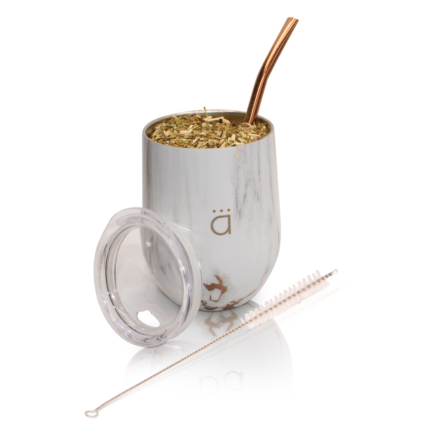 Includes: Gold Marble XL Mate Gourd, Organic Yerba Mate, Rose Gold Bombilla and cleaner brush!